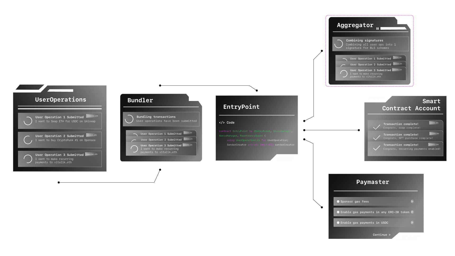 > **Sources**: [Ethereum](https://eips.ethereum.org/EIPS/eip-4337), [ERC4337.io](https://www.erc4337.io/), [Alchemy](https://www.alchemy.com/learn/account-abstraction)